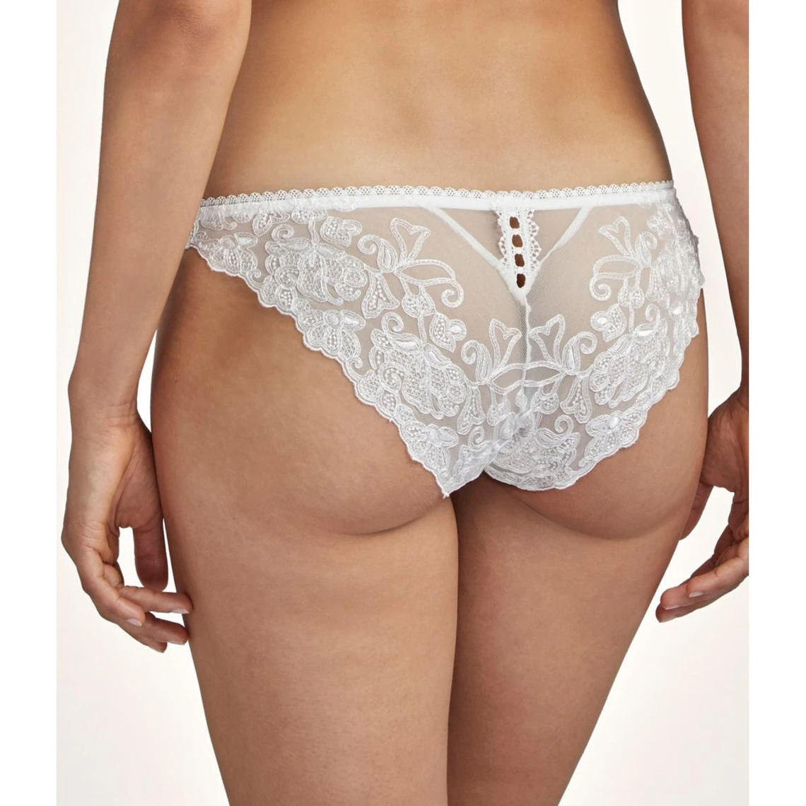 Conçue en tulle surmontée de broderie, elle attire par son jeu de transparence, dévoilant sensuellement la peau. Sa grande douceur au toucher confère confort et bien-être accrus au porté. Sa ceinture se compose d’un élastique picoté agrémenté d’un discret petit nœud en satin.