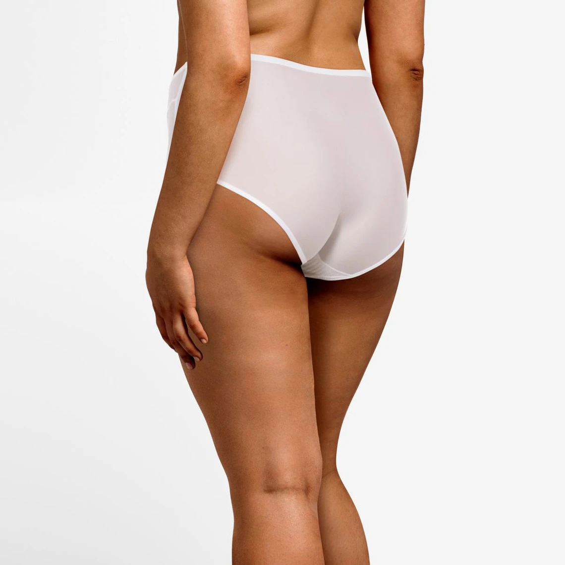 Les parties transparentes, laissant entrevoir la peau, séduisent les yeux et apportent la touche raffinée de cette pièce. De dos, on adore la vue de la matière au contact de la peau qui épouse à merveille les courbes du fessier et des hanches. Confort et maintien sont au rendez-vous tout au long de la journée.