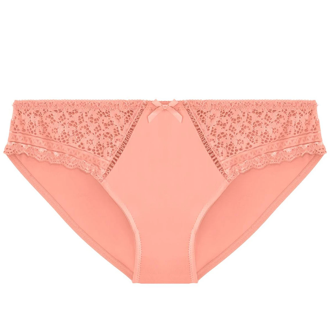 Slip grand confort. A l’avant, dentelle et microfibre unie, séparées par un jour échelle. Nœud satiné à la ceinture. Au dos, microfibre unie. Elastiques fantaisies à la taille. Doublure 100% Coton. Disponible du 38/40 au 46/48.