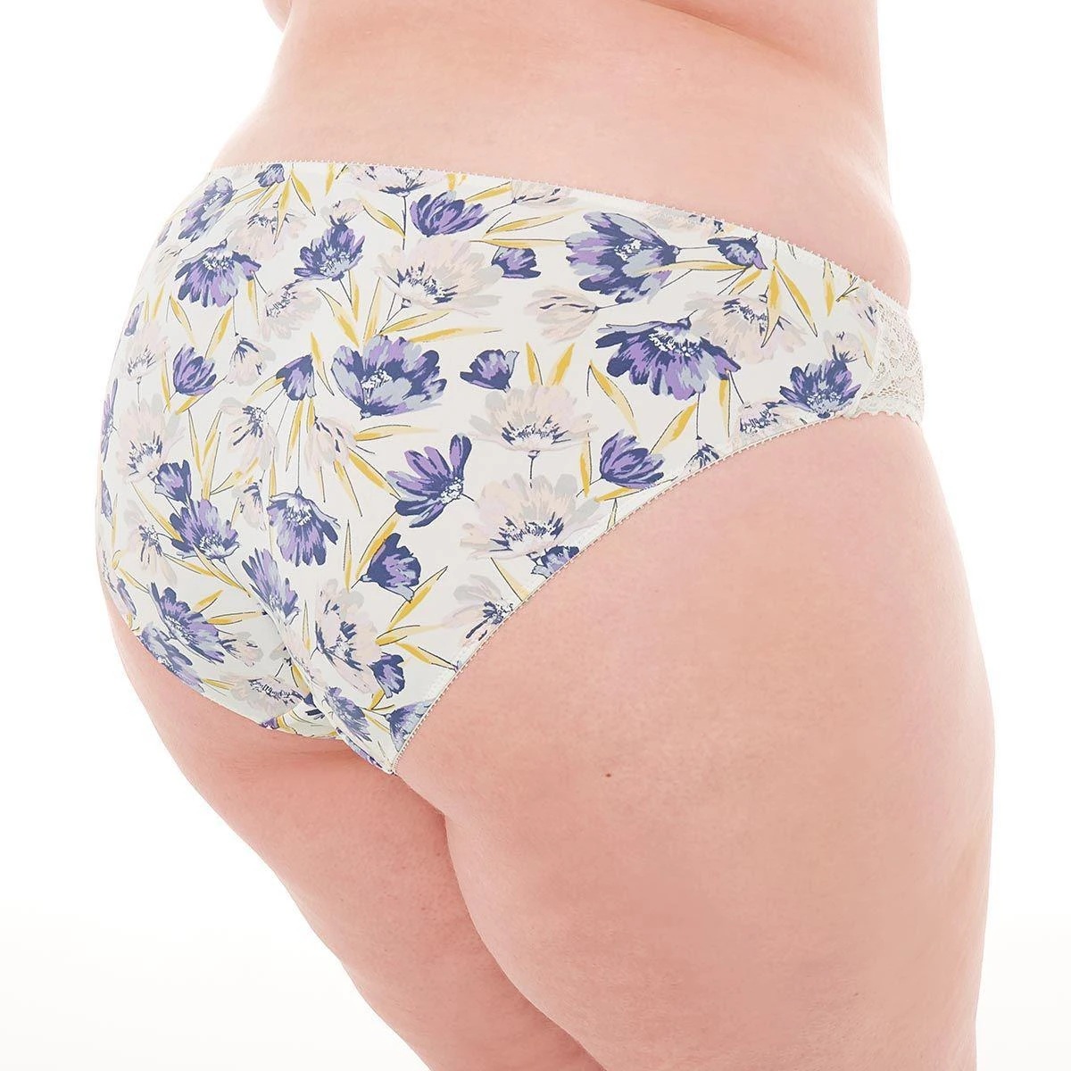 Slip en microfibre douce et confortable imprimée au motif « fleurs ». Dentelle florale. Nœud et bijou perle à la ceinture. Fond doublé d’un gousset 100% coton. Disponible du 42/44 au 50/52