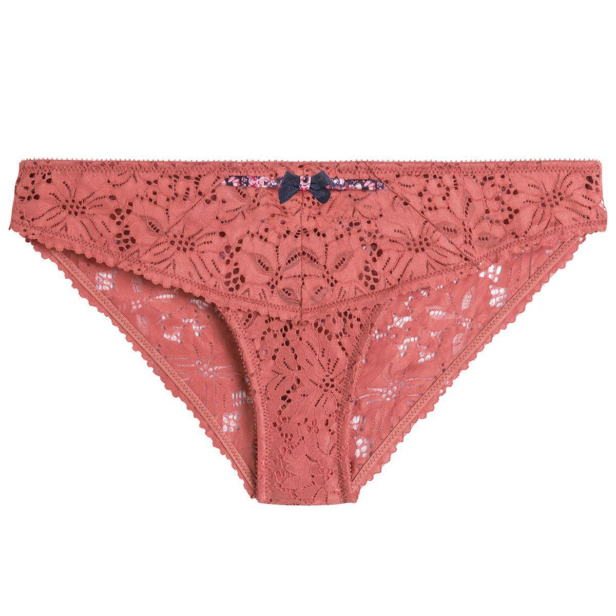 Slip en dentelle florale. Nœud satin à la ceinture. Fond doublé d’un gousset 100% coton. Disponible du 38/40 au 50/52