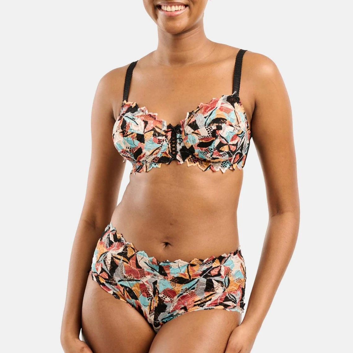 Ce modèle très féminin séduit avec sa dentelle colorée ajourée et imprimée et son jeu de laçage original sur les côtés. À l’entrejambe et sur le bas de fesses, il présente un tulle opaque doux qui masque votre intimité tout en vous procurant un excellent confort. Avec son gousset en coton, il vous promet une hygiène impeccable durant toute la journée.