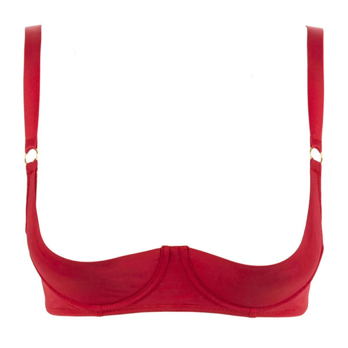 Le soutien-gorge seins nu est composé d’une maille au rouge intense. Votre poitrine est entièrement dénudée.
