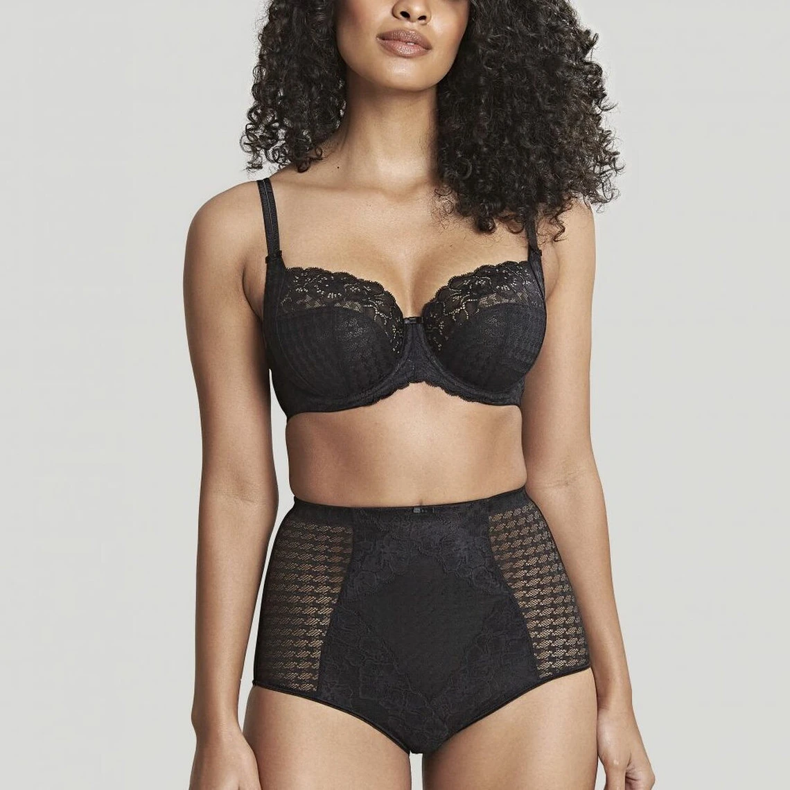 Cette culotte taille haute de la marque Panache est un modèle très tendance et d’inspiration vintage. En effet ce modèle allie un motif jacquard dent de chien qui évoque un côté rétro avec une dentelle florale pour former un ensemble original et très moderne. Les motifs jouent également un jeu de transparence au niveau des hanches qui est très sexy et la dentelle est positionnée de façon géométrique ce qui accentue le coté rétro du modèle. La culotte taille haute possède une gaine de contrôle afin de flatter la silhouette et de mettre en valeur votre ligne sous vos vêtements même les plus moulants. Les bords de la culotte sont également doublés ce qui permet d’éviter les démarcations disgracieuses. Grèce à cette fonction galbante vous ne pourrez plus passer de ce must-have que vous pouvez porter en toutes circonstances. Disponible de la taille 36 à 48, existe aussi en coloris noir et en version culotte taille basse.