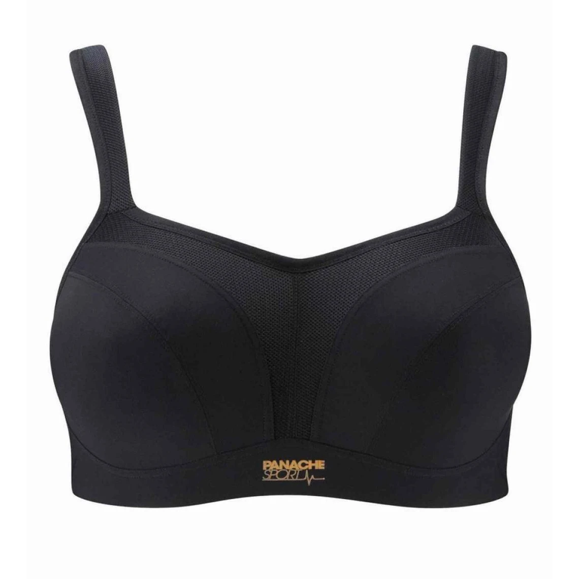 Soutien-gorge sport Sports bra de Panache en maille renforcée sur les bonnets pour un maintien et un confort optimal. Modèle avec de très légères armatures mais surtout avec un élastique très large en guise de basque et de larges bretelles ce qui lui permet de monter jusqu’à G dans les tailles de bonnets. Les bretelles peuvent se positionner de chaque côté des épaules ou bien en dos croisé grèce à un petit clip se trouvant au dos. Ce soutien-gorge possède des agraphes pour convenir parfaitement à chaque type de femmes. Le logo Panache est positionné sur l’élastique de tour de dos.