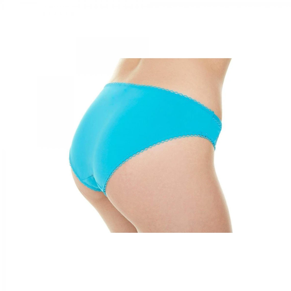 Slip en microfibre unie avec empiècement de broderie sur les côtés. Elastiques fantaisies à l’ouverture jambe devant et dos. Finition délicate par un biais élastiqué et un élastique fantaisie en guise de ceinture. Nœud en gros grain contrasté à la taille. Dos en microfibre unie. Gousset en 100% coton