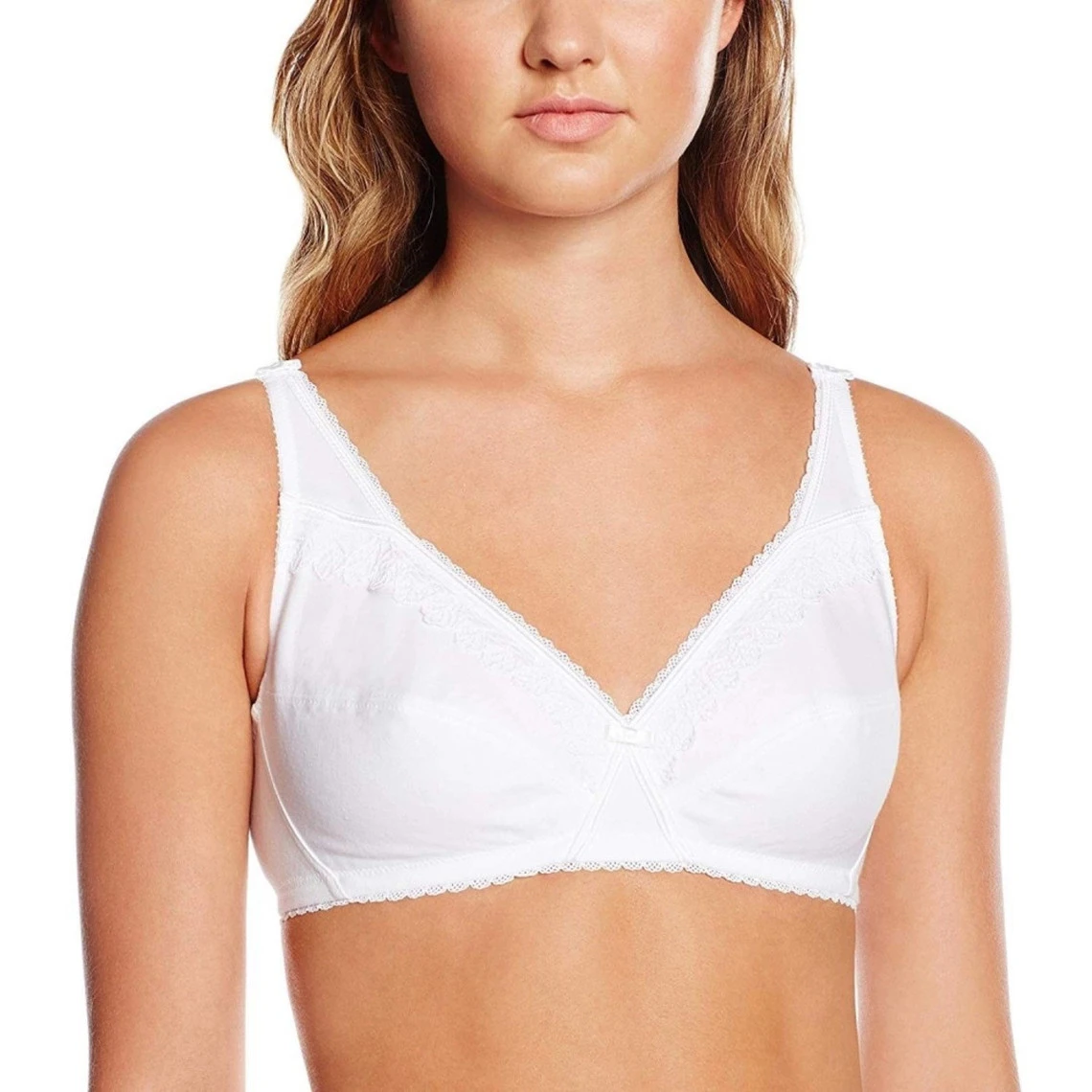 Le soutien-gorge sans armatures Playtex blanc se compose de 86 % de coton pour un confort inégalable ! Sa forme emboitante couvre la poitrine et la couvre de douceur pour passer une journée tout en confort. Des bandes de dentelle blanches sont disposées dans le décolleté pour donne une touche très féminine. Un élastique est placé sous les bonnets et se termine à la fermeture au dos, pour permettre un bon maintien, sans armatures. Des très jolis picots blancs se trouvent dans le décolleté et remontent sur les bretelles. Ils se trouvent aussi sous la bande élastique sous les bonnets. Un petit noeud en satin blanc se pose sur les bretelles et un autre au niveau de l’entre-sein. Le tour de dos est en forme de dos cheminé, pour un meilleur maintien. Des bandes de satin blanc se croisent sur les bonnets.