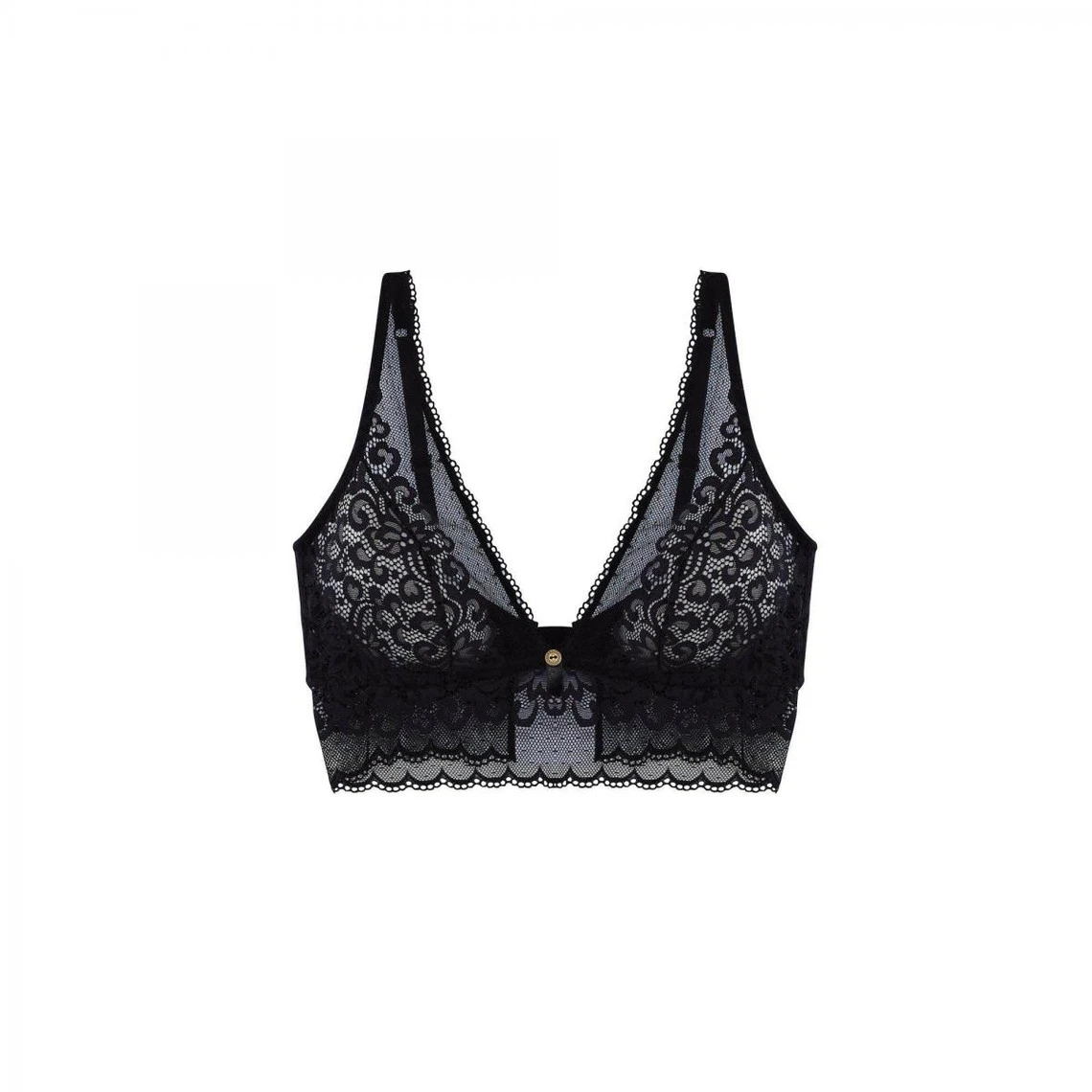 Soutien-gorge en dentelle noire visuelle et texturée. Entresein habillé d’un petit ruban satiné rehaussé d’un bouton fantaisie métallique. Elastique sous poitrine et basque tout dentelle. Fermture dos 1 agrafe 3 positions.